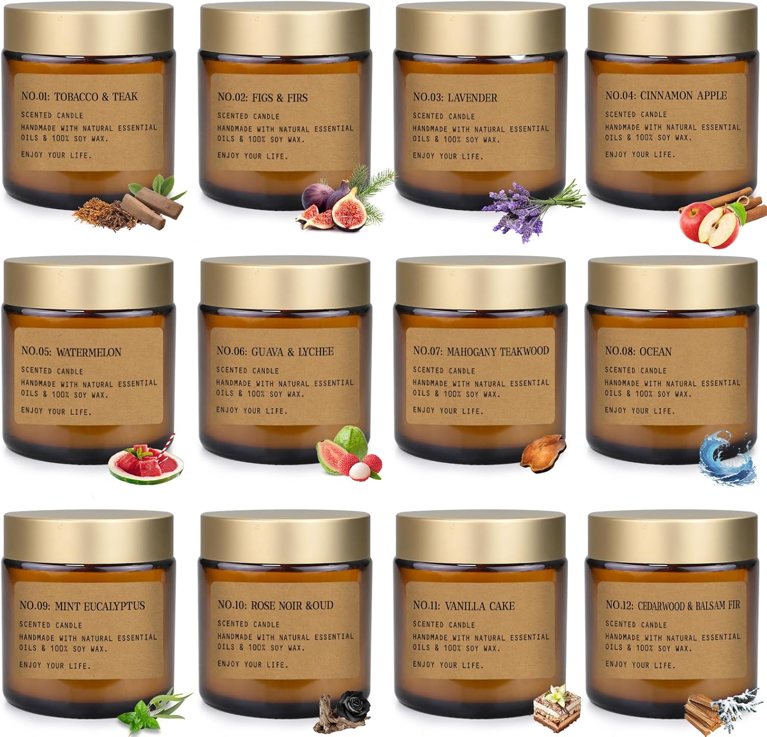 Duftkerze 12er Set Kerzen Geschenkbox, Natürliches Sojawachs 300h Brenndauer, für Yoga, SPA