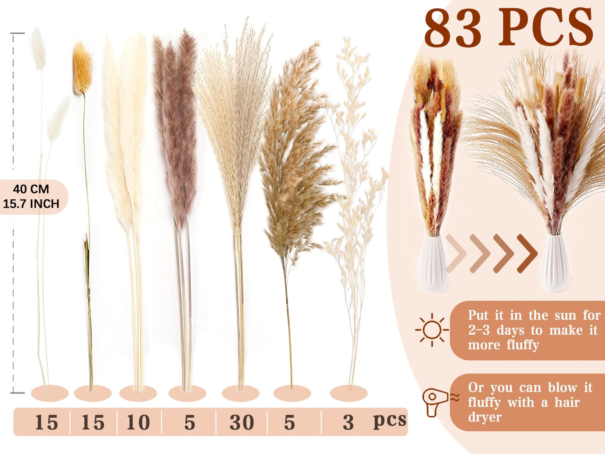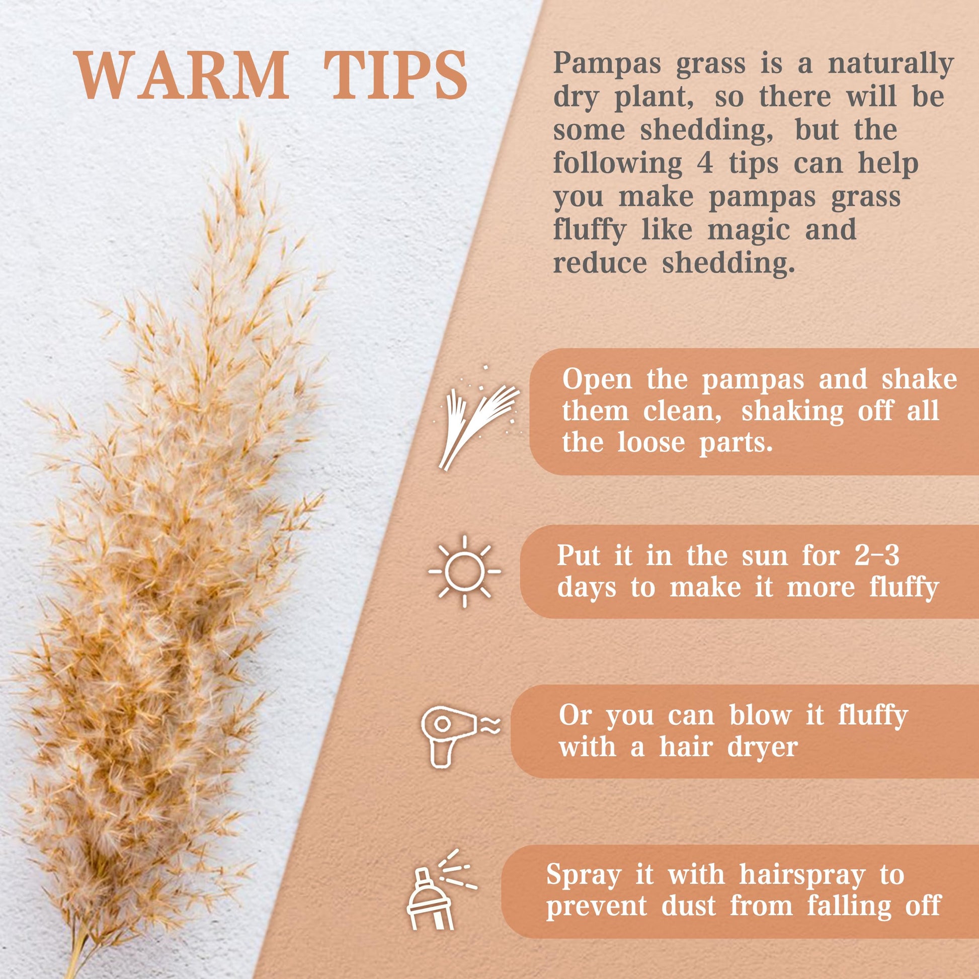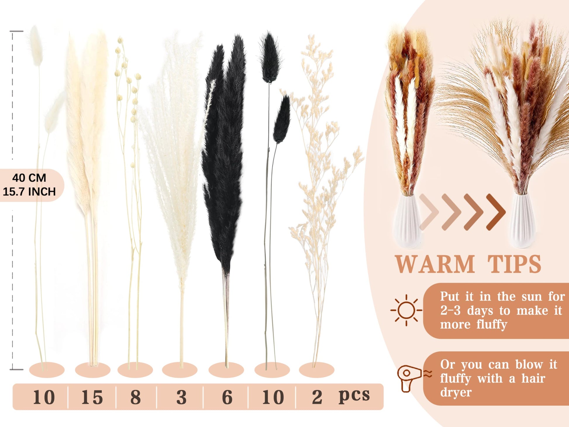 - 🌾 Verpackung und Verwendung: Der Strauß wird während des Transports verpackt und gepresst. Legen Sie ihn nach dem Öffnen der Verpackung 2-3 Tage in die Sonne, um ihn flauschiger zu machen. Sie können auch einen Fön verwenden, um trockene Pampas und Haarspray aufzulockern, um Haarausfall zu reduzieren. Federn können durch Schütteln verloren gehen, das ist normal, auch keine Sorge.