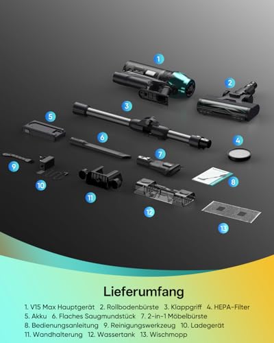 - 【Lange Laufzeit, sorgenfreie Reinigung】 Der V15Max Akku Staubsauger ist mit einer starken Batterie bestehend aus 8 Lithium-Ionen-Zellen ausgestattet, bis zu 60 Minuten Laufzeit im FLOOR-Modus - ausreichend für ca. 200 m². Drei Ladeoptionen: Gerät direkt laden, über Wandhalterung oder Akku separat laden. Dieses durchdachte Design passt sich jedem Wohnlayout an, gewährleistet ständige Einsatzbereitschaft und unterbrechungsfreie, hocheffiziente Reinigung.
