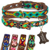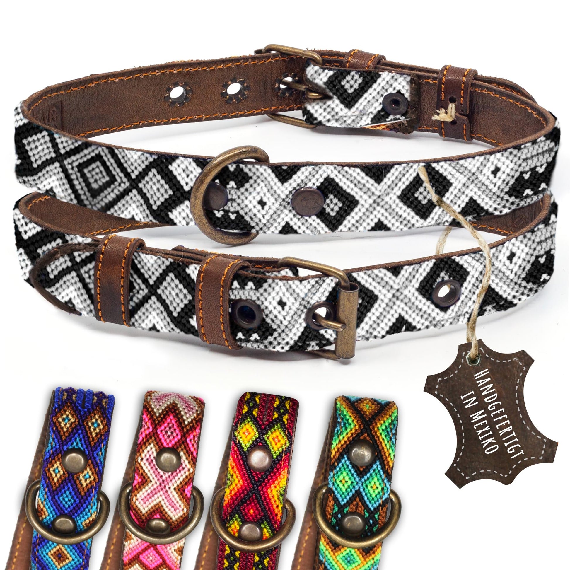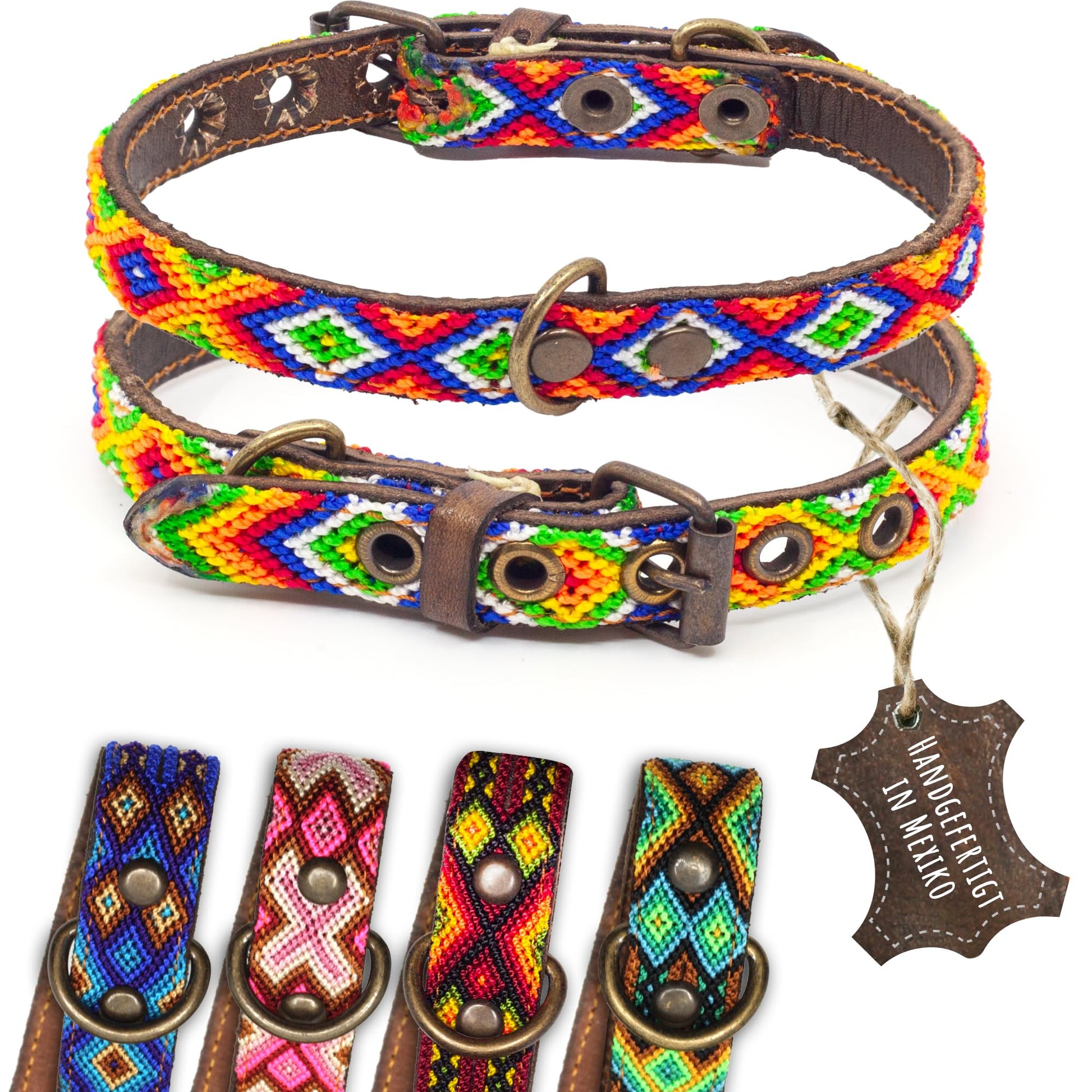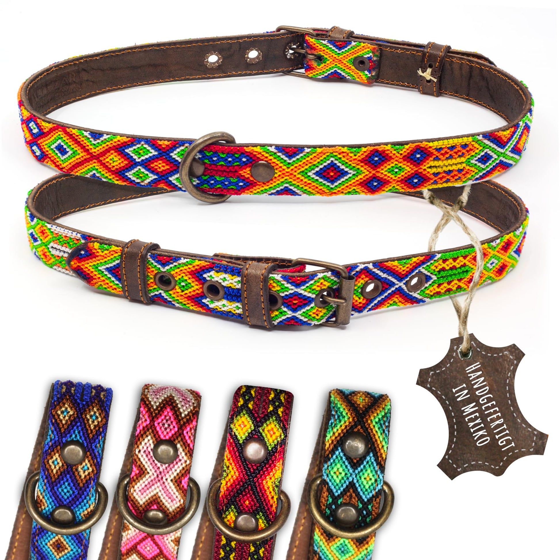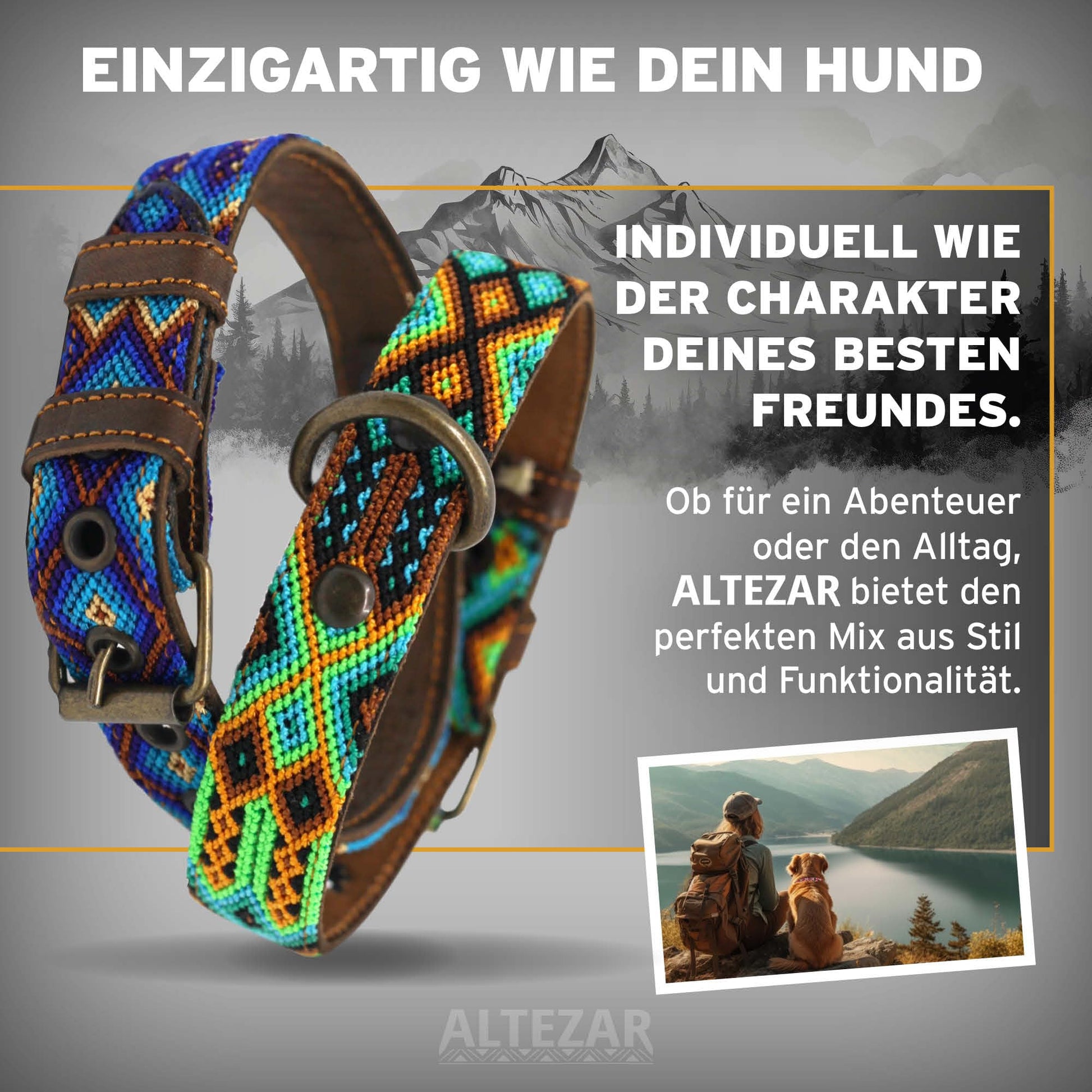 - Hund🐶 KOMFORTABLES ECHTLEDER: Dieses spezielle Material macht das Halsband sehr leicht. Die Oberfläche auf der Außenseite ziert das handgefertigte, grün, ocker, blau, braune Maya Muster. Auf der Innenseite naturbelassen weich, bietet das Halsband hautschonenden Tragekomfort.