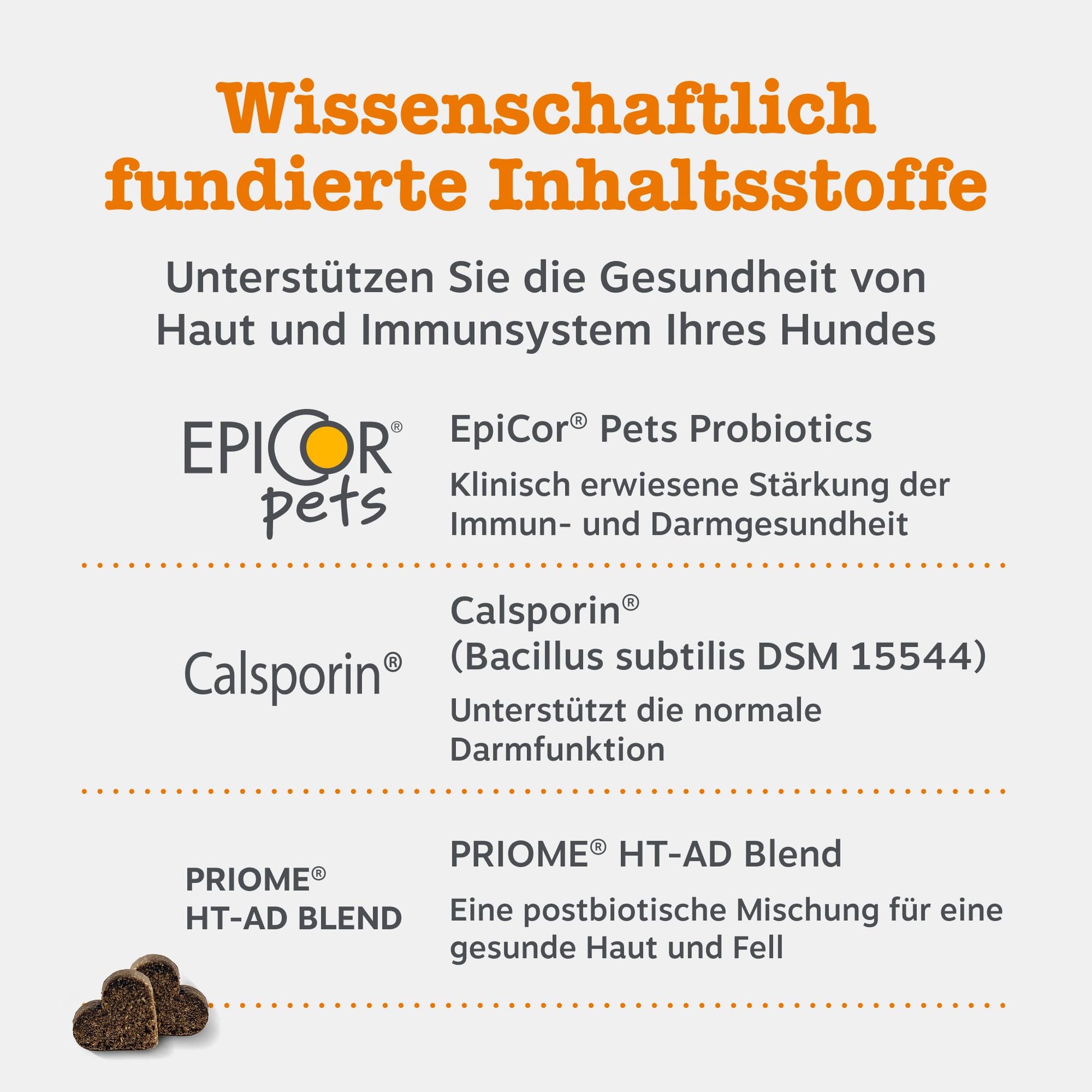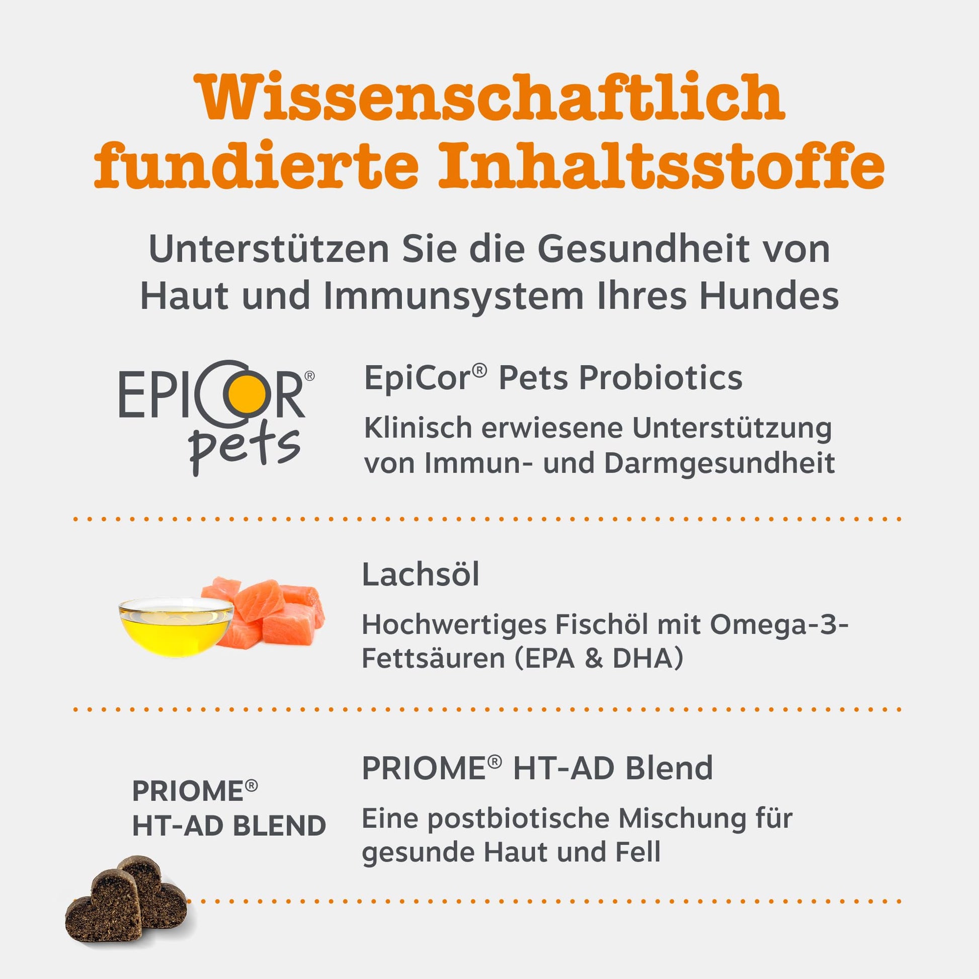 • Bei juckender Hundehaut – Die fortschrittlichen Inhaltsstoffe dieser Hundegesundheitsprodukte wurden auf eine natürliche Immunabwehr getestet, für einen aktiven Hund mit gesunder Haut ohne Juckreiz.