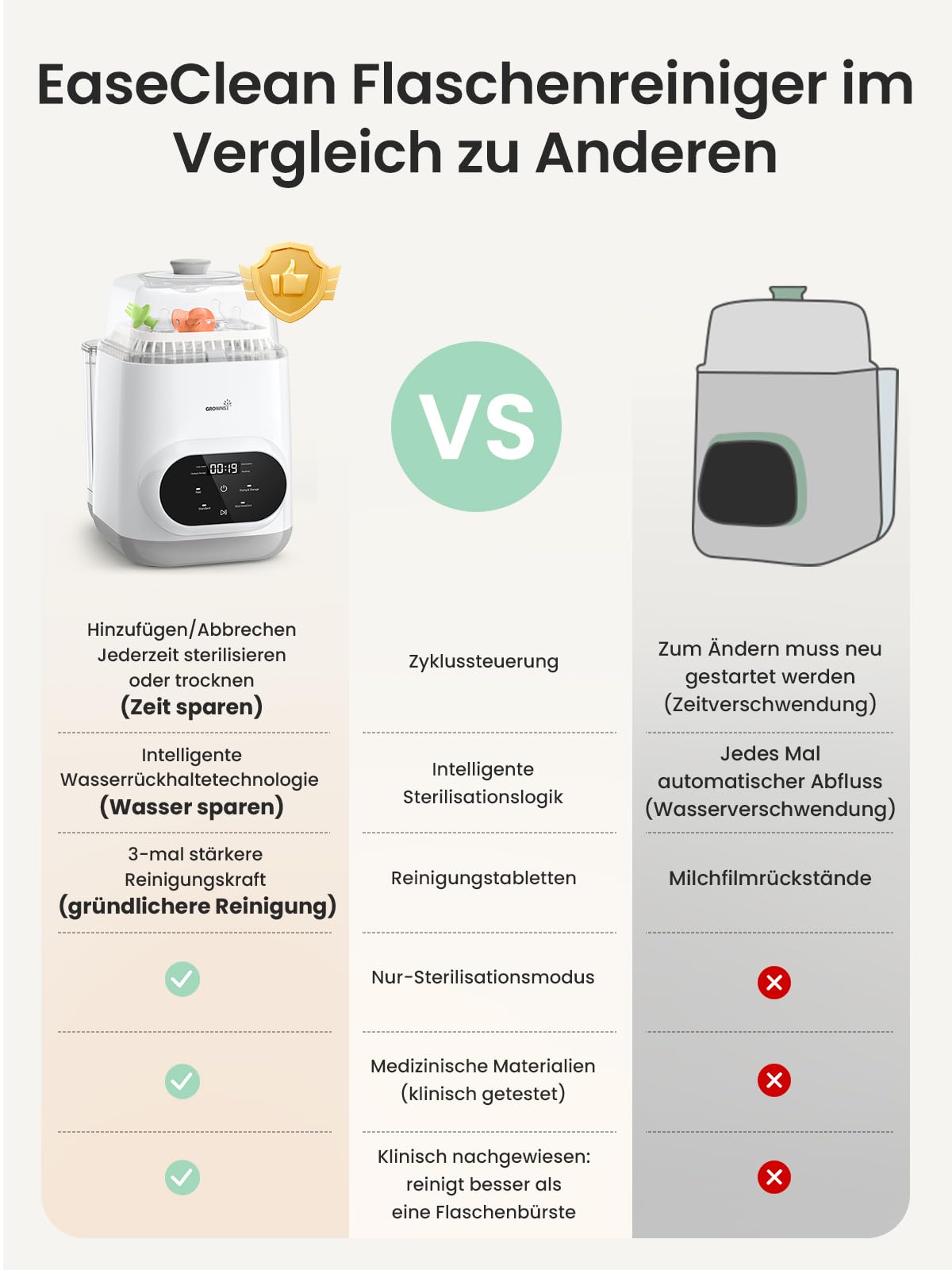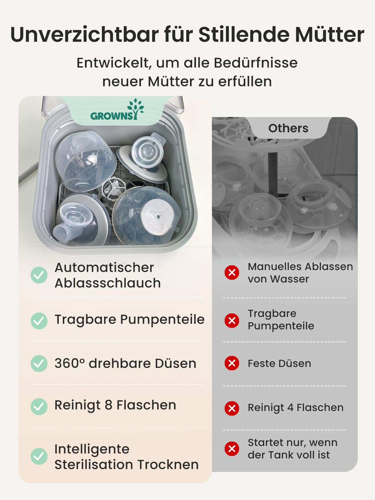 - 4-in-1 EaseClean Bottle Cleaner Pro: The Grownsy bottle cleaner cleans, disinfects, dries and stores bottles, dummies, pump parts, cups and other baby accessories automatically. It saves time and energy by eliminating manual cleaning. An essential baby product for families with young children.