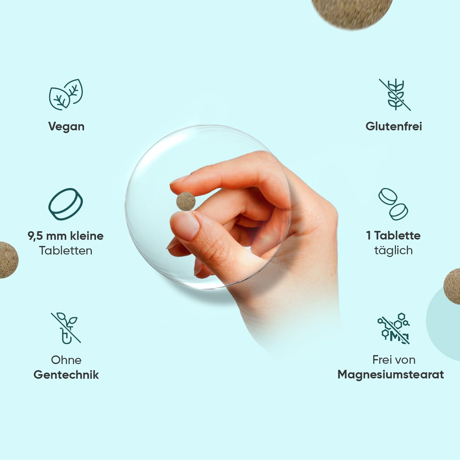 • Vegan and sustainable packaging: Our tablets are free from gluten, lactose, flavours, dyes and allergens and are of course made without genetic engineering and animal testing. Our products are climate friendly and we use reusable packaging to reduce our carbon emissions. They are also manufactured under GMP standards according to strict European guidelines.