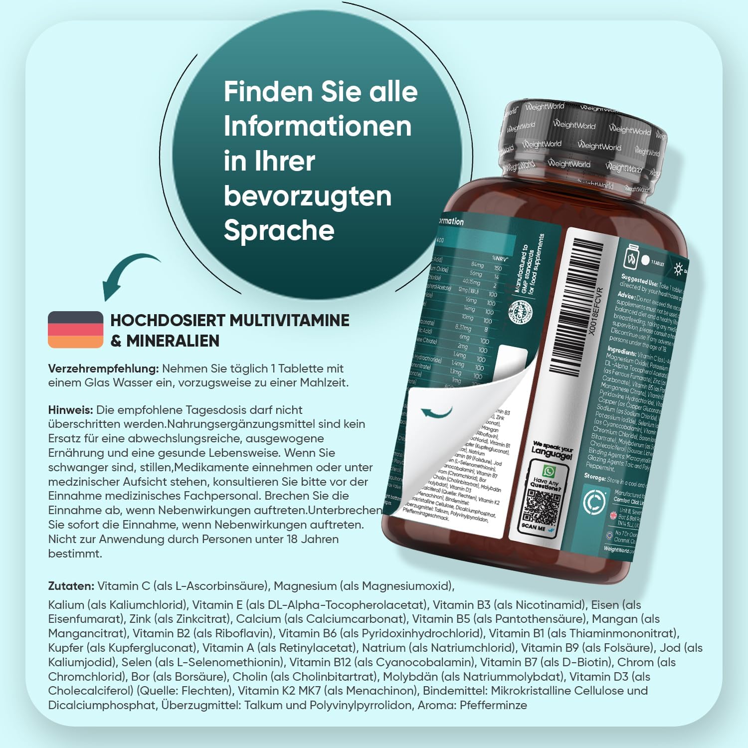 • WeightWorld Multivitamin tablets: Our multivitamin tablets last more than 1 year and contain 27 essential vitamins and minerals such as vitamin A, B complex, biotin, vitamin C, vitamin D3, vitamin E, vitamin K, folic acid, vitamin B12, iron, magnesium, calcium, selenium, chromium, copper, iodine, boron, choline and zinc. So you get all the vitamins in one tablet. Take 1 tablet daily with a glass of water and with a meal.