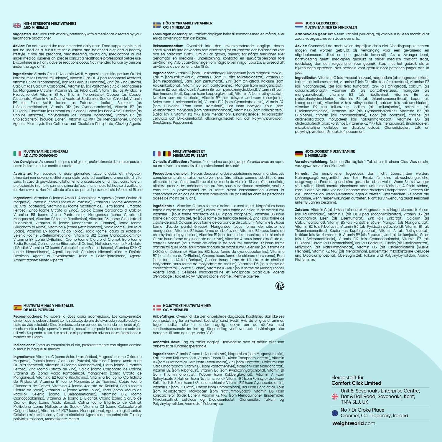 • 27 vitamins and minerals in one tablet: According to EFSA vitamin D plays a role in the process of cell division and contributes to the maintenance of teeth. Zinc contributes to normal cognitive function and potassium to maintain normal blood pressure. Copper contributes to normal iron transport in the body and iron contributes to normal oxygen transport in the body. Biotin contributes to the maintenance of hair and skin and choline contributes to the maintenance of normal liver function.
