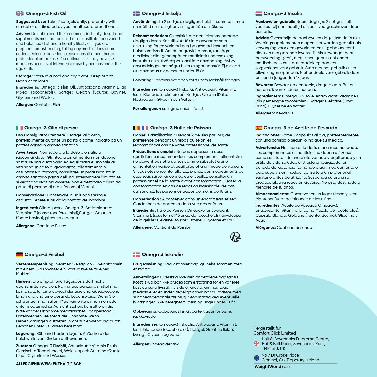 • 2000mg Omega3 öl Kapseln - Jede Portion enthält 2000mg Fischöl, das 1100mg Omega 3-Fettsäuren liefert, 660mg EPA (Eicosapentaensäure) & 440mg DHA (Docosahexaensäure). Die Omega 3 Softgels werden aus Fischöl hergestellt, das essentielle Fettsäuren wie EPA und DHA enthält.