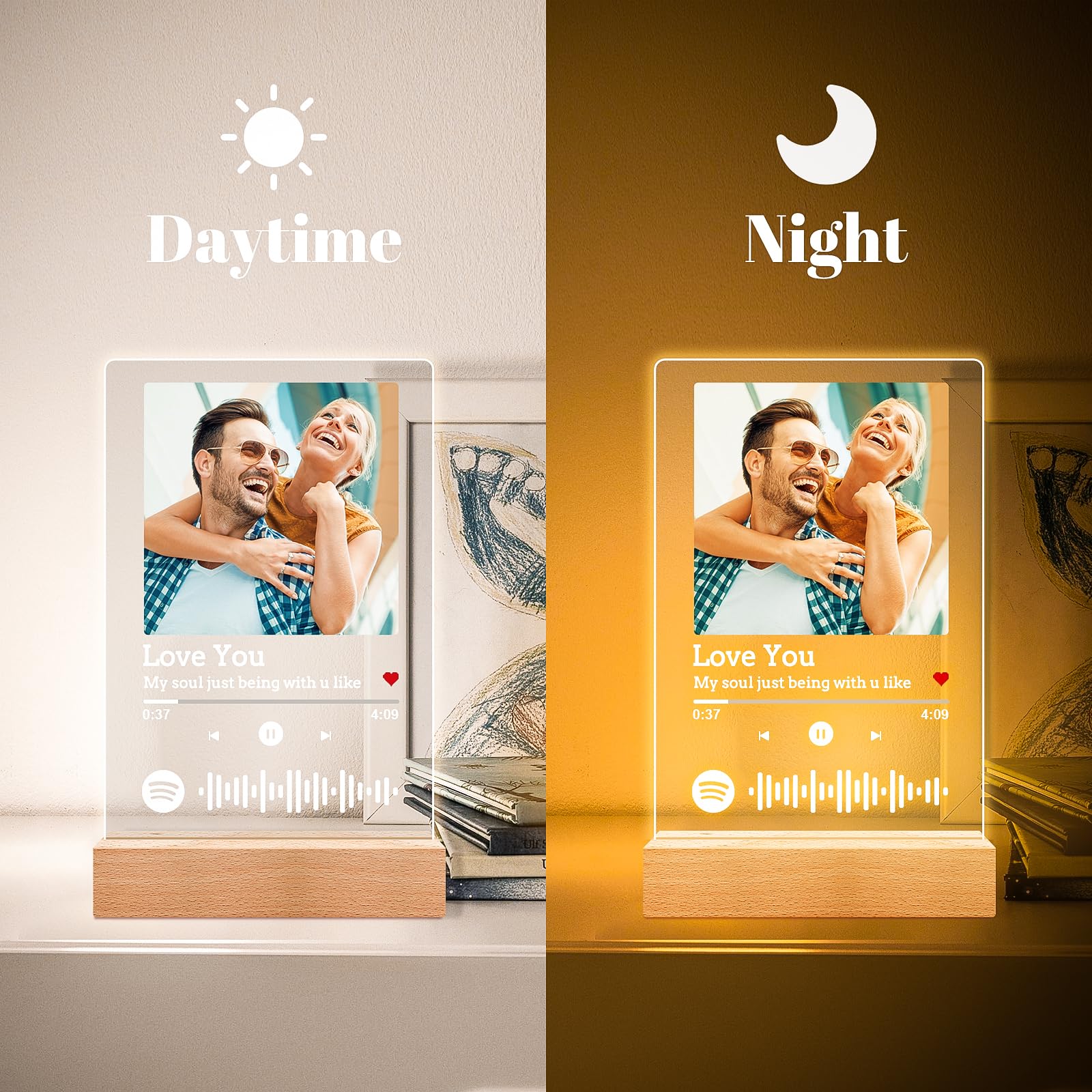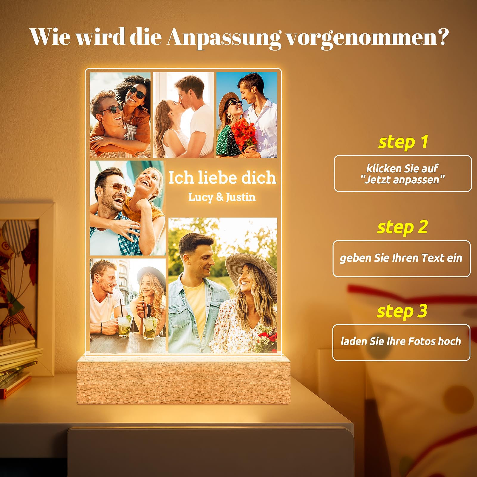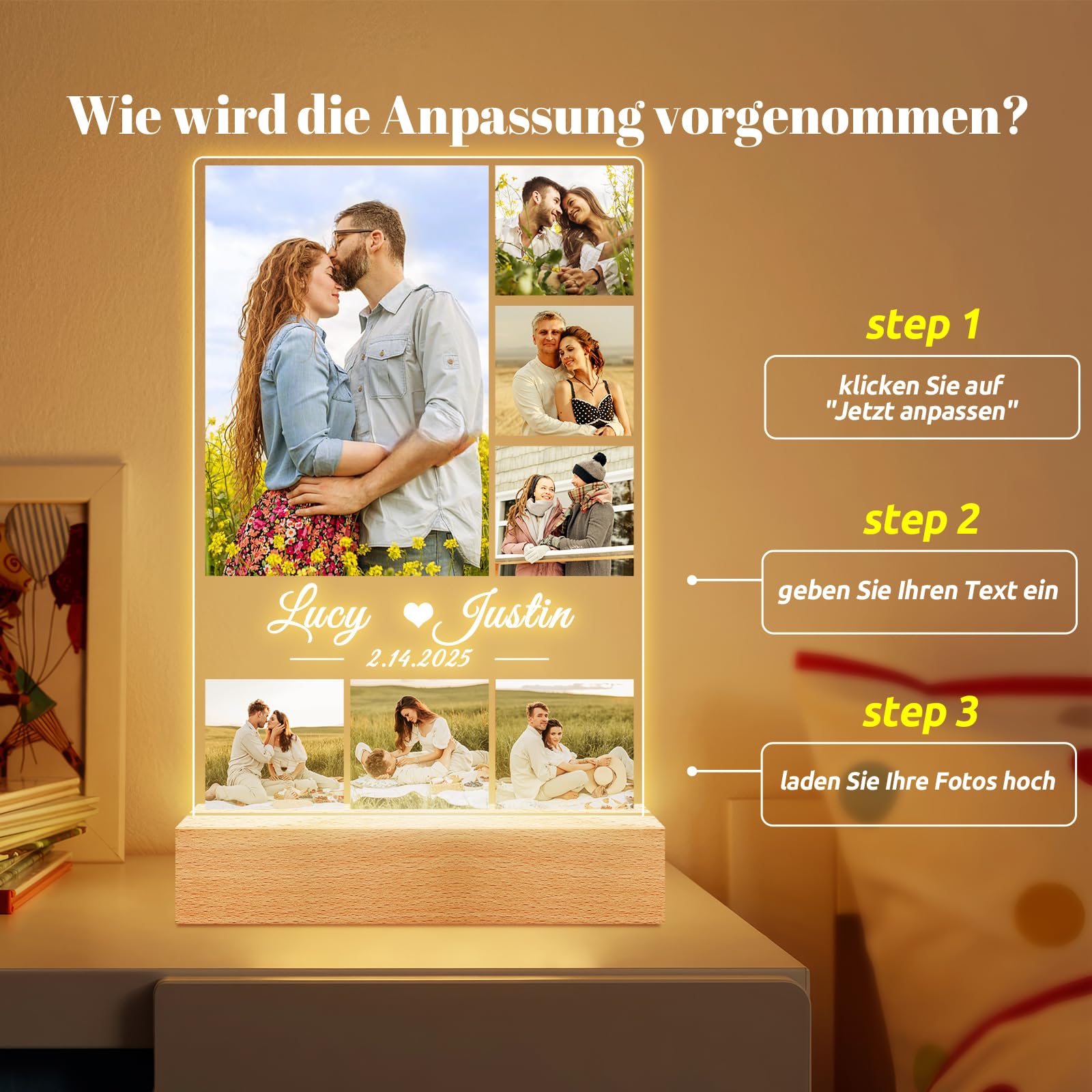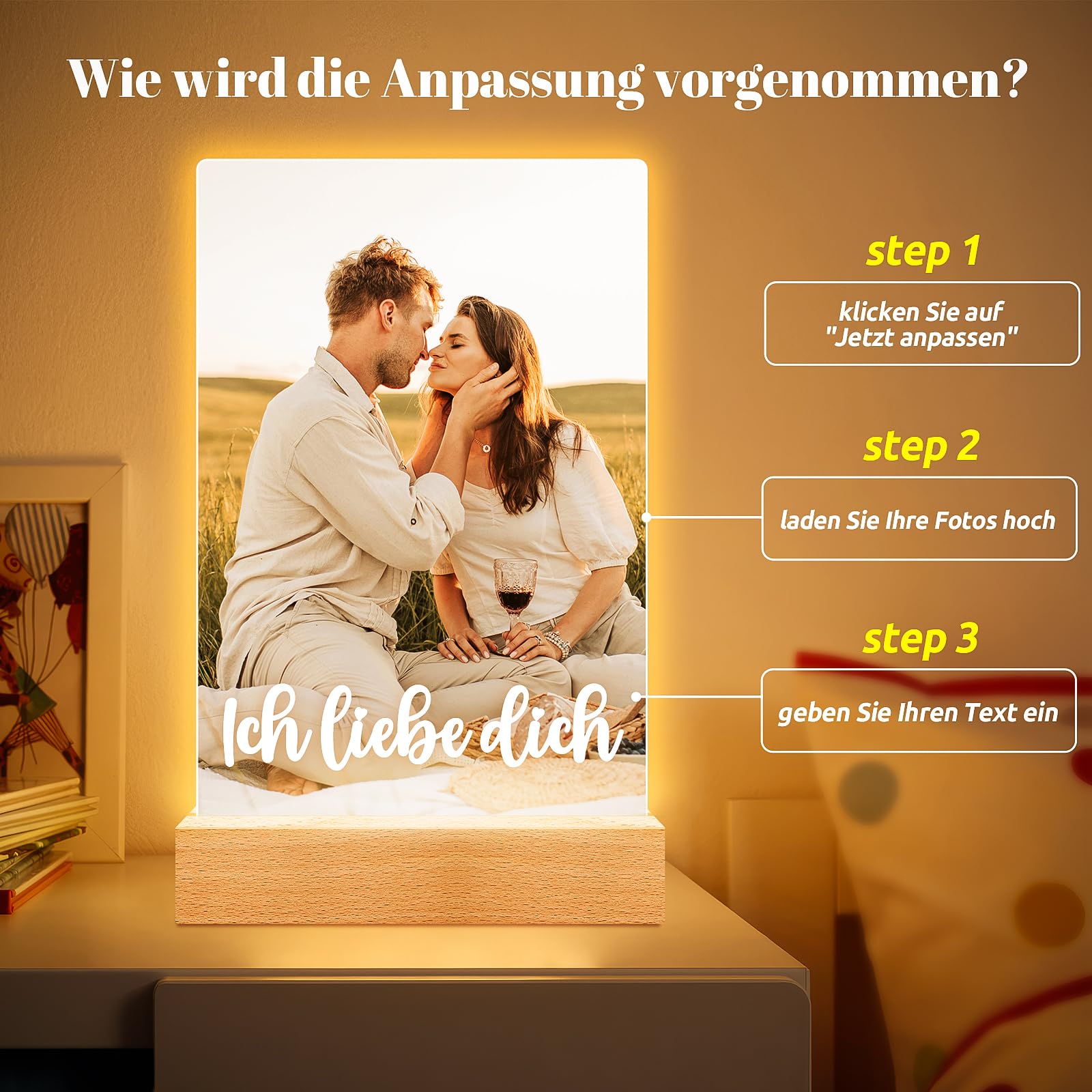 Cadeaux photo personnalisés - vous aide à personnaliser chaque photo et texte.Effet de lumière chaude - L'effet de lumière doux crée une atmosphère chaleureuse et romantique.Impression Ultra HD - Fabriqué avec la technologie d'impression UV pour une clarté photo inégalée.Matériaux de haute qualité - Fabriqué en verre acrylique de haute qualité avec jusqu'à 95% de transmission de la lumière.Attention aux détails - Le verre acrylique a un film protecteur sur sa surface qui gardera sa brillance.Installation facile Faites simplement glisser le cadre photo en acrylique dans la fente de base et vous êtes prêt à partir.