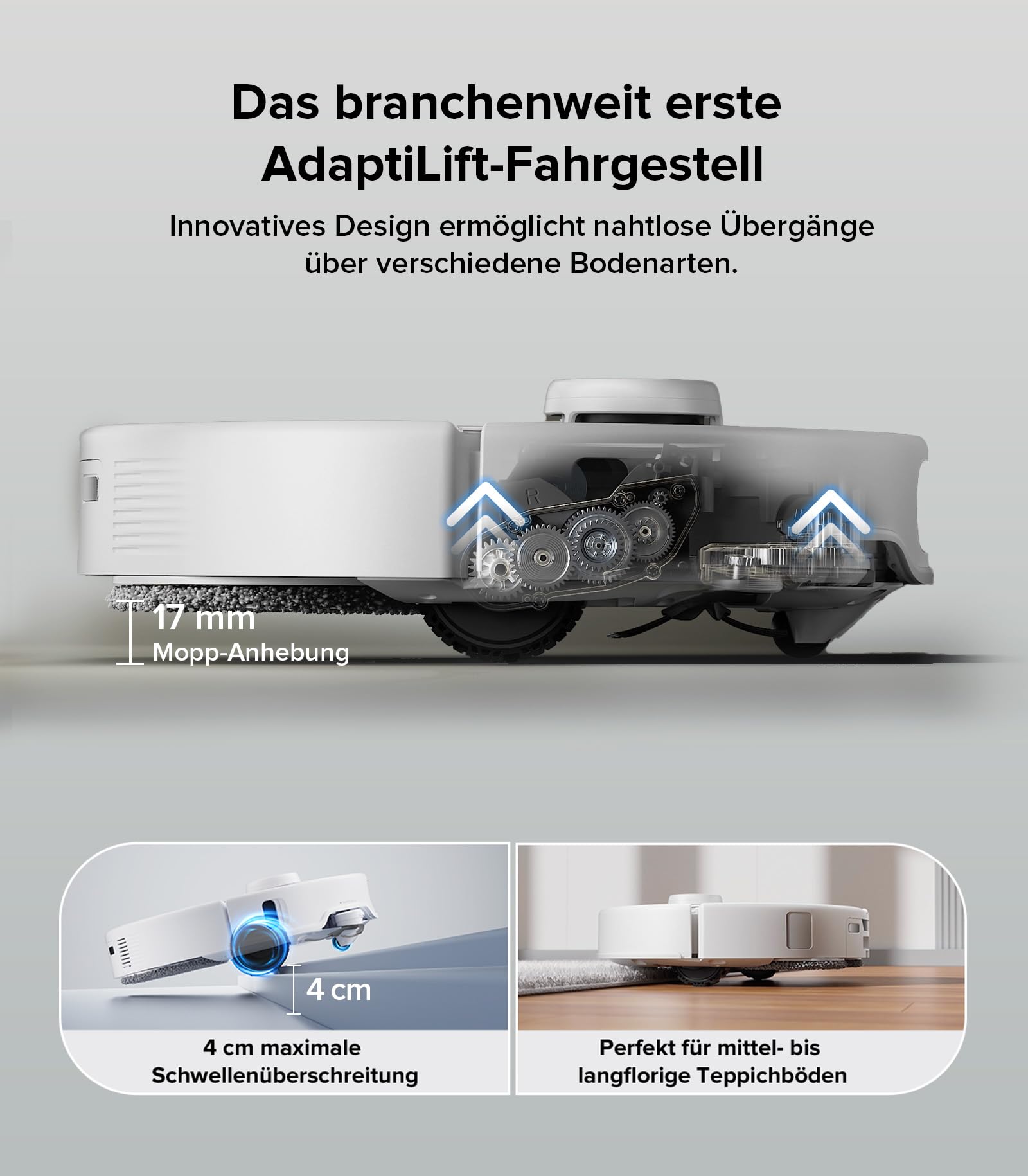 • [Châssis AdaptiLift] Obtenez un nettoyage optimal grâce au châssis AdaptiLift, une première dans le secteur. Il permet d'obtenir différents niveaux de levage grâce à trois roues réglables indépendamment. Il permet de surélever l'ensemble du châssis de 10 mm, ou seulement la moitié avant, arrière, gauche ou droite, pour une adaptation optimale à votre environnement domestique.