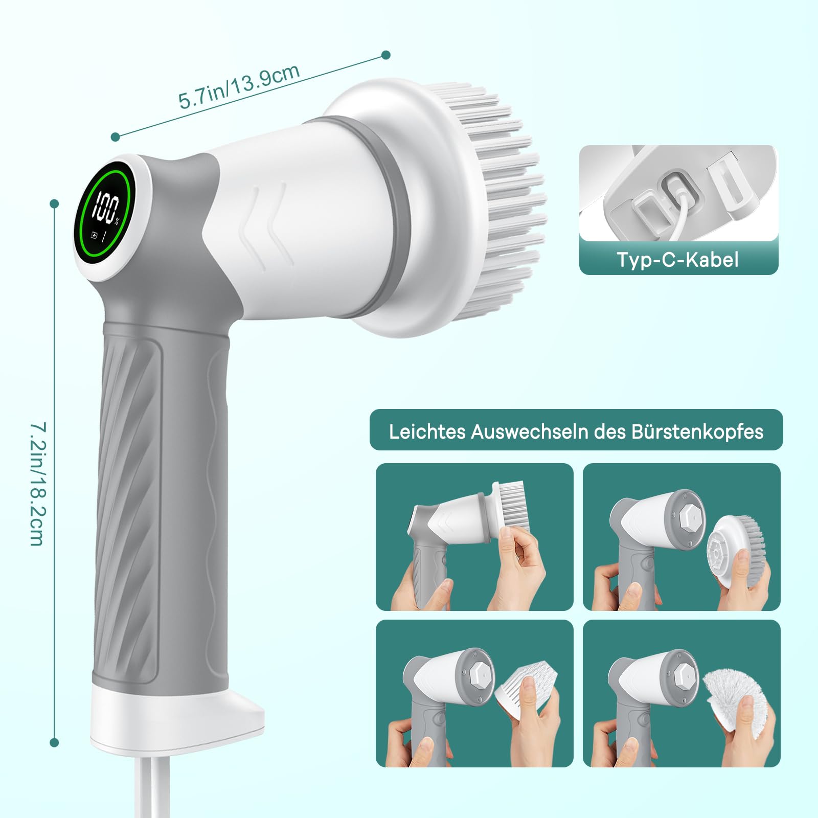 • Wiederaufladbarer Akku durch USB Typ C und lange Laufzeit - Der elektrische Spin Schrubber ist mit der neuesten USB Typ C Schnellladetechnologie und einer Batterieanzeige ausgestattet, keine Sorge, dass der Akku sich während der Reinigung entleert. Die elektrische Reinigungsbürste verwendet einen 2500mAh Hochleistungsakku. Durch USB Typ C lädt sich der Akku schnell in nur 2 Stunden auf und hat eine Akkulaufzeit von 60 Minuten, was die Ladeeffizienz und die Akkulaufzeit verbessert, die Einschränkung durch Kabelentfernung und die Reinigung des Zuhauses vereinfacht.