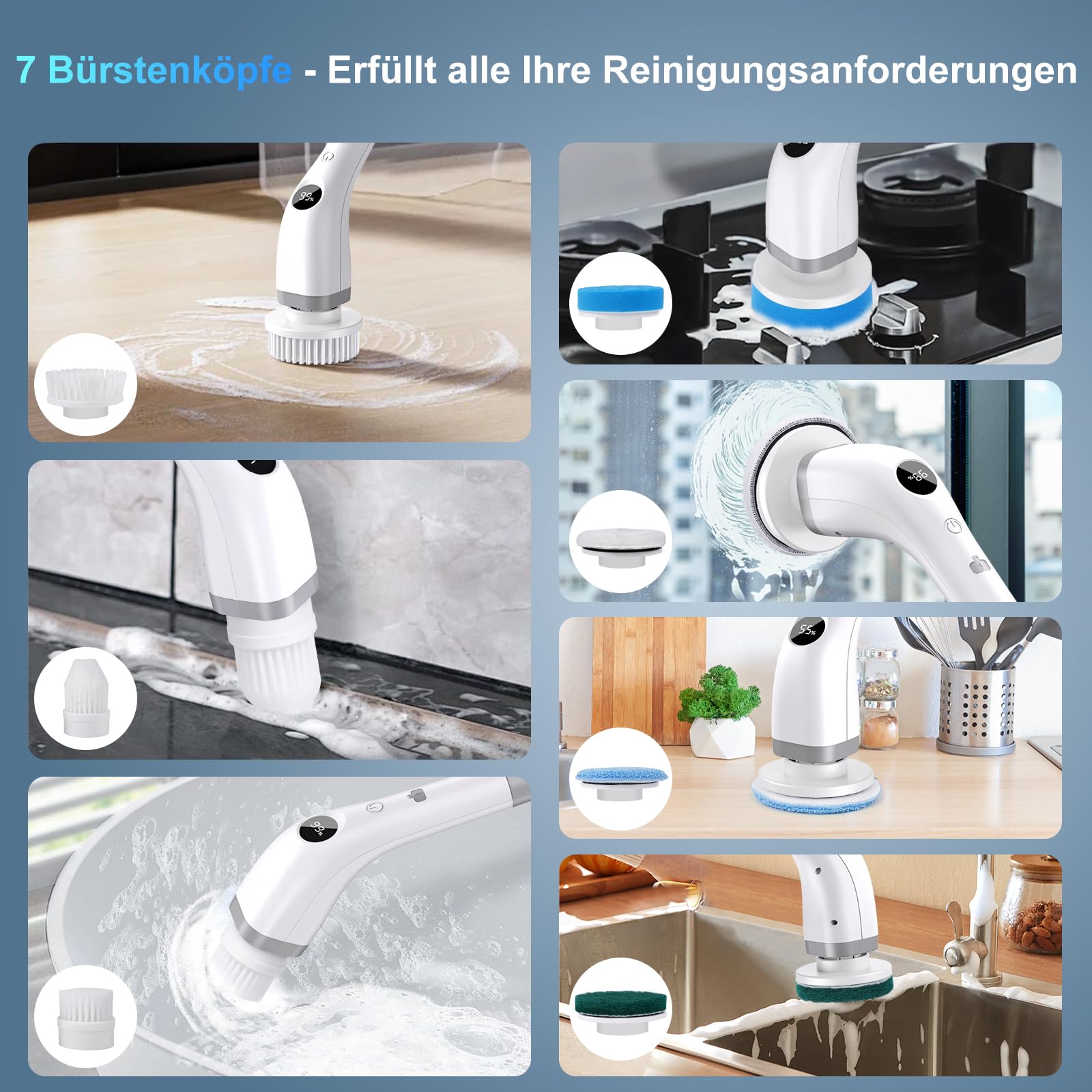 • 7 multifunktionale Bürstenköpfe – Die kabellose rotierende Reinigungsbürste bietet 7 multifunktionale, austauschbare Bürstenköpfe, die für verschiedene Verwendungszwecke geeignet sind. Große Flachbürste für das Badezimmer, kleine Flachbürste für die Küche, Spitzbürste für Ecken, kleiner Mopp zum Fensterputzen, Wollbürste zum Polieren von Autos, Faserbürste zum Reinigen großer Fettflecken in der Küche, Schwammbürsten zum Reinigen von Autooberflächen und zum Geschirr spülen. Erhalten Sie ein Set von elektrischen Bürsten für den Reinigungsbedarf in allen Aspekten. Sie können den Nachschub für die Aufsätze von uns bestellen.