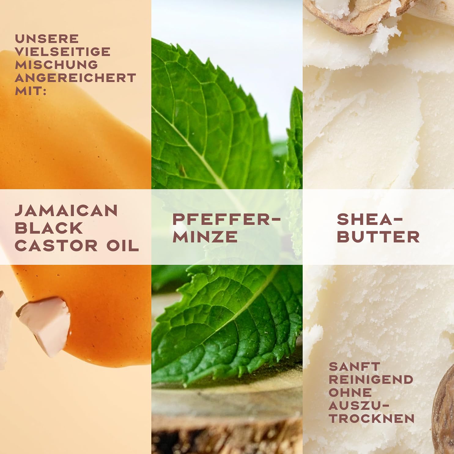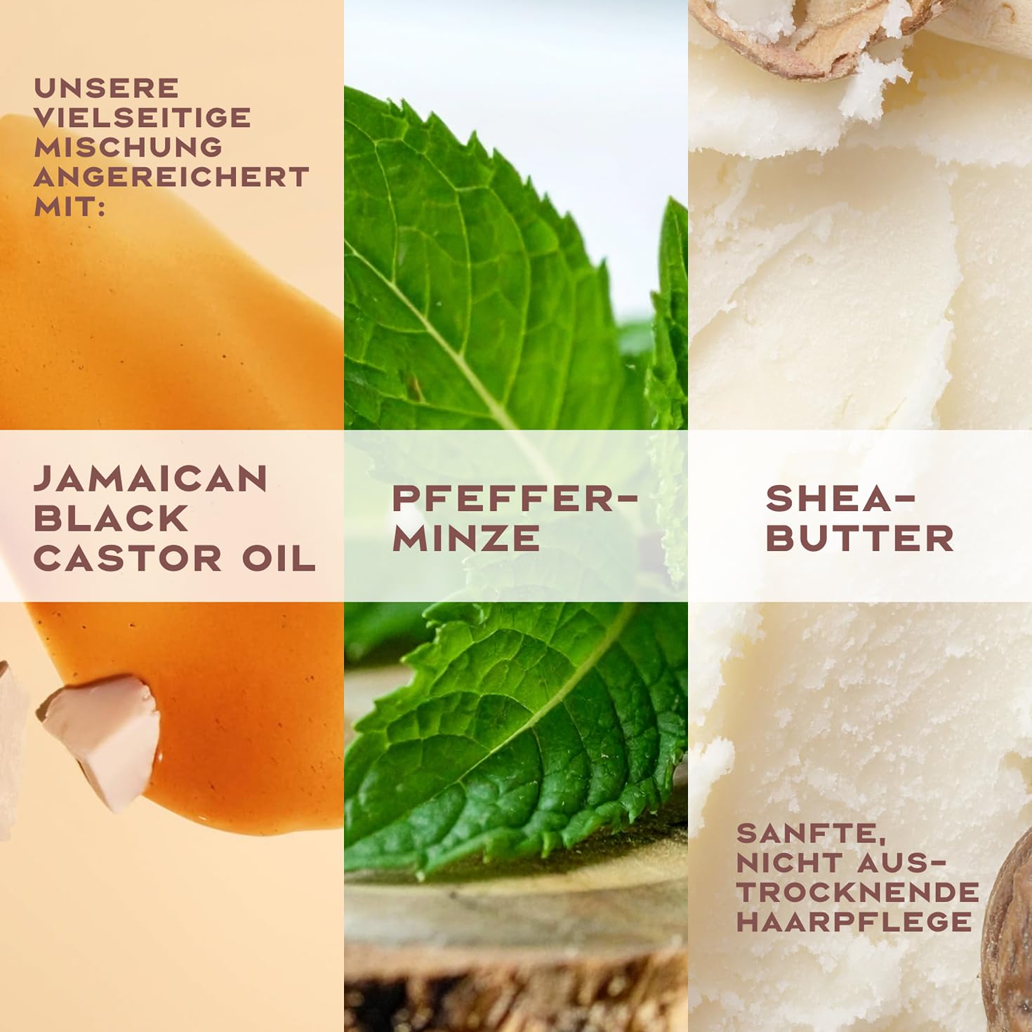 • Weichspüler für das Haar, angereichert mit Sheabutter und jamaikanischem Rizinusöl