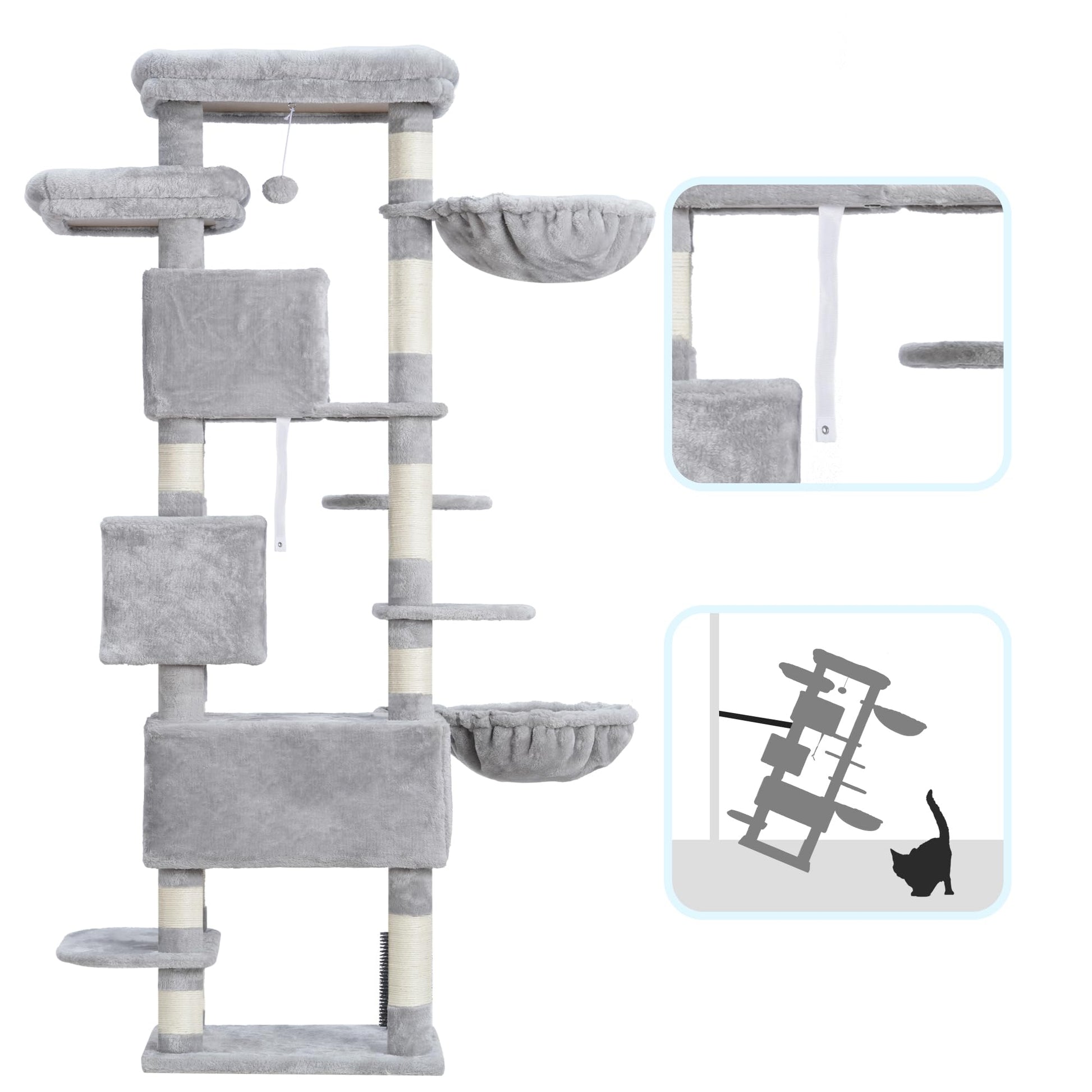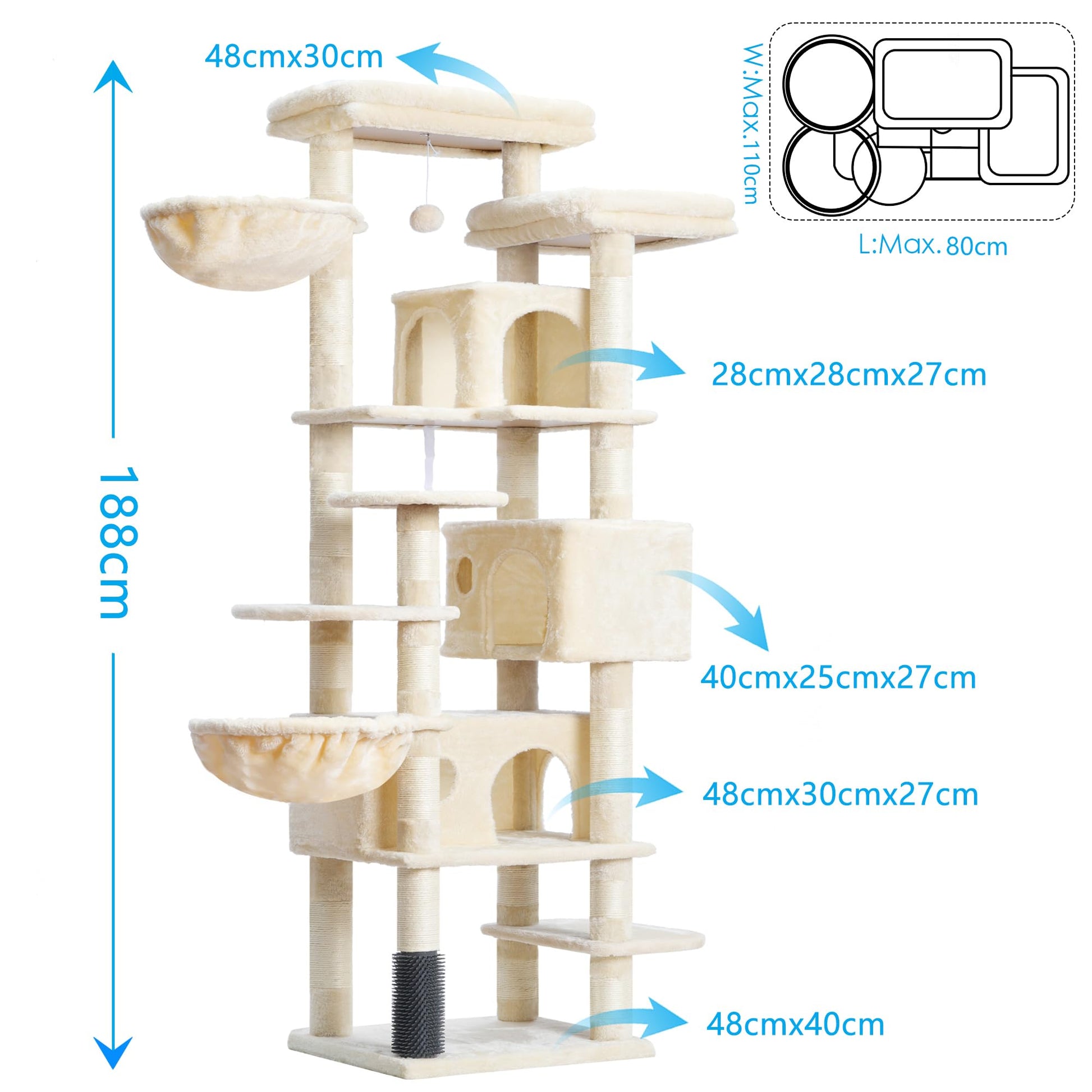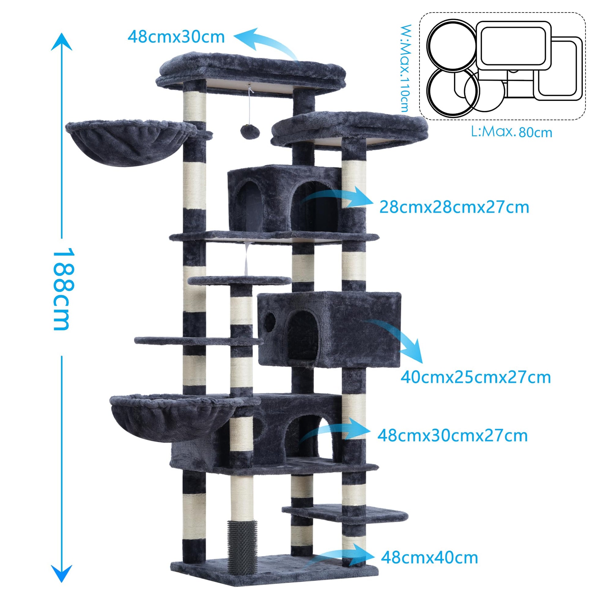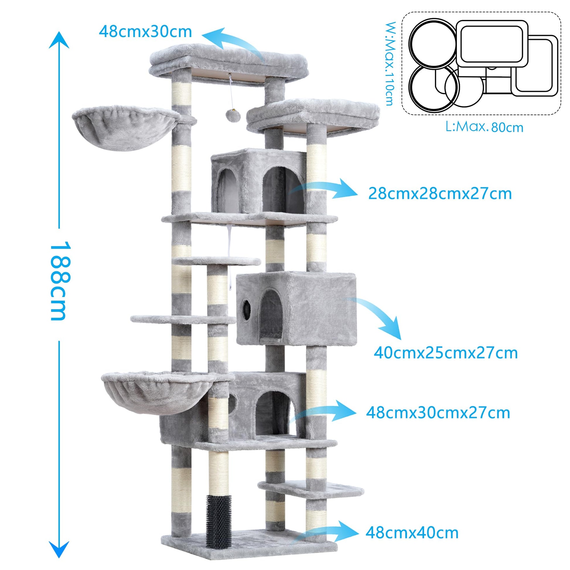 • Hoher Kratzbaum mit mehrstufigem Design: Der Katzenbaum ist 188 cm hoch und die Struktur ist so konzipiert, dass Katzen jeder Größe mit Leichtigkeit hoch und runter springen können.