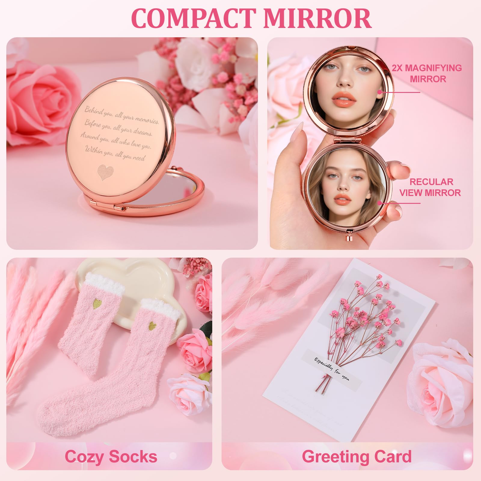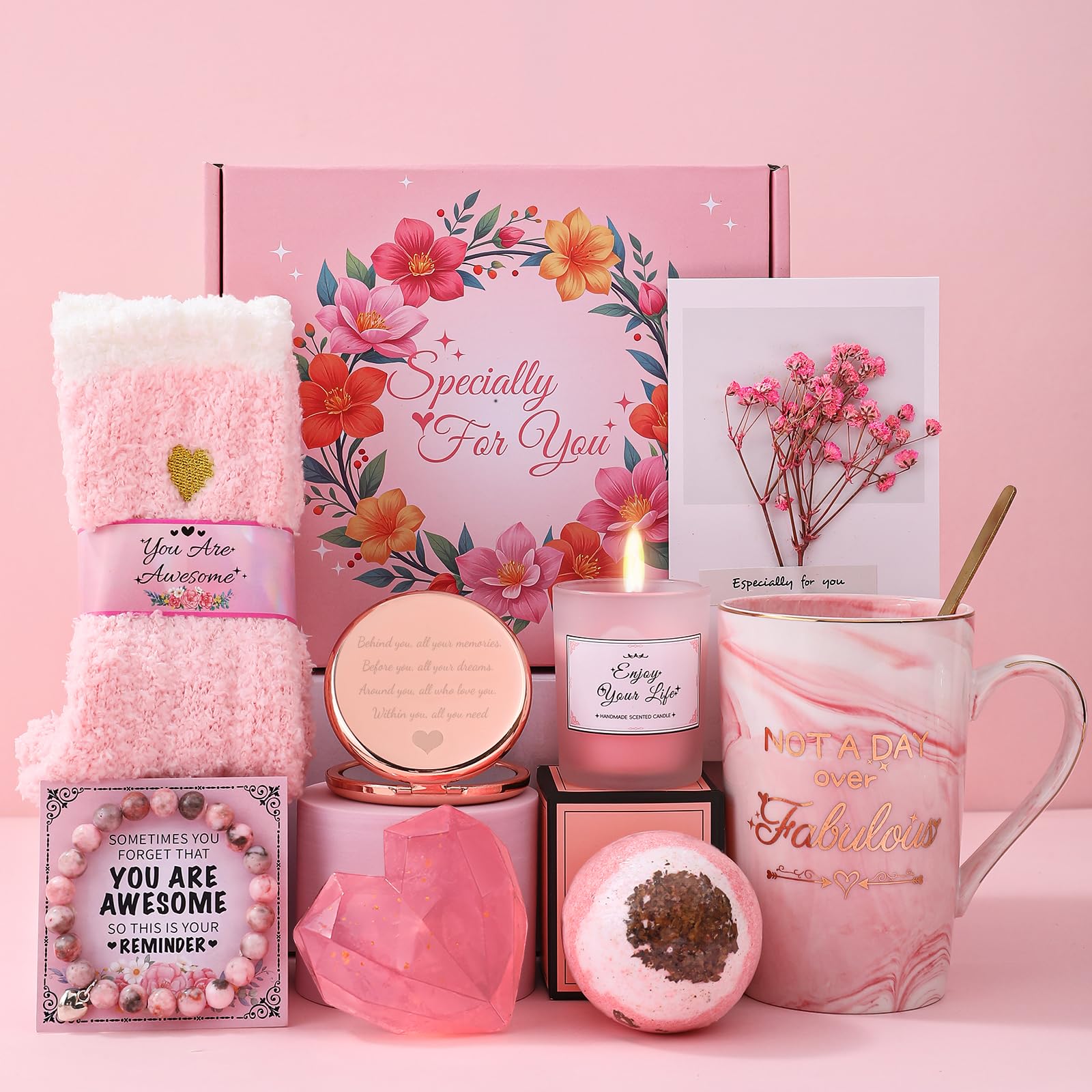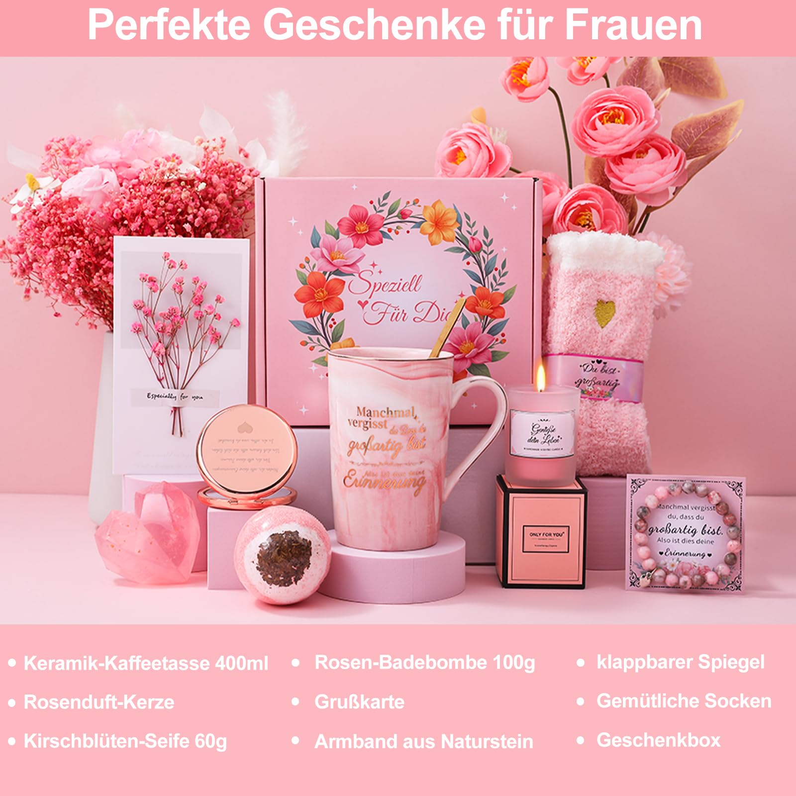 - Einzigartiges Geburtstagsgeschenk für Frauen: Dieses wundervolle Geburtstagsgeschenk für Frauen ist Ihre beste Wahl. Der elegante Geburtstagsgeschenkkorb für Frauen enthält 9 Artikel: 1* 400 ml Keramiktasse (mit Deckel und Löffel), 1* Roségold-Spiegel, 1* Sojawachs-Duftkerze, 1* Armband aus Natursteinen, 1* Paar Kuschelsocken, 1* Kirschblütenseife 60g, 1* Rosenblüten-Badesalz 100g, 1* Geburtstags Papier-Kronenhut.