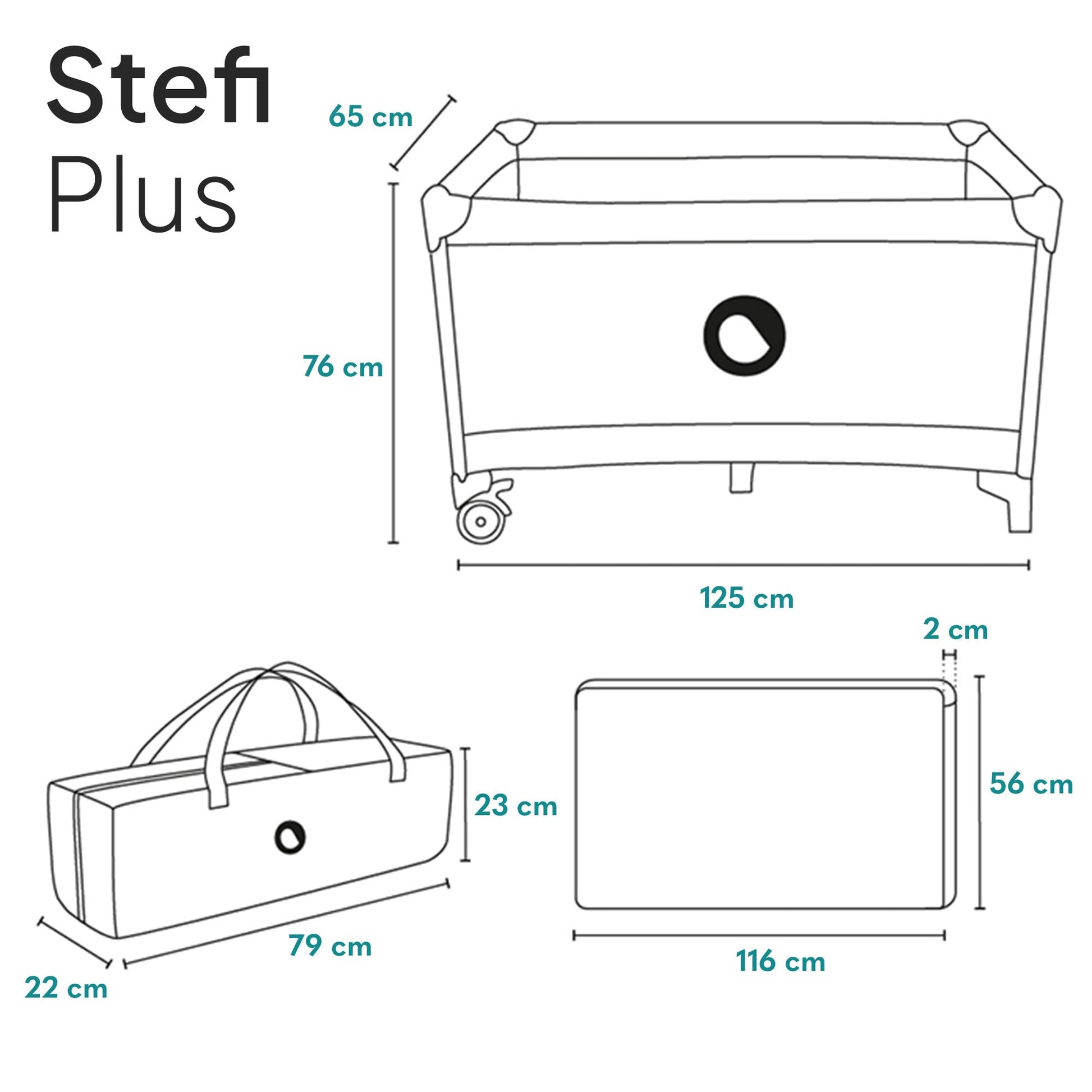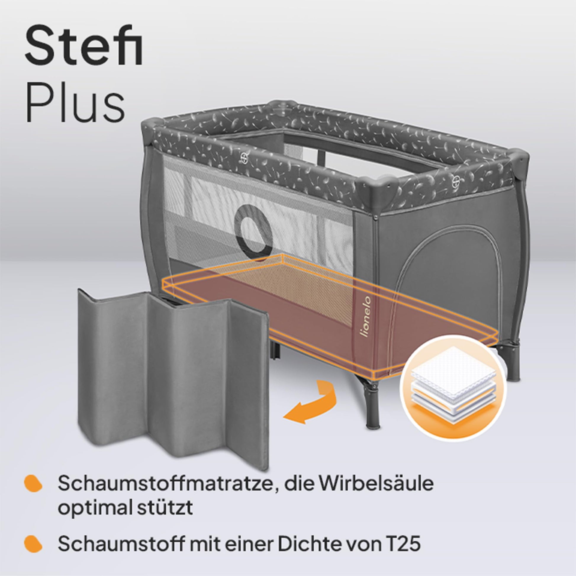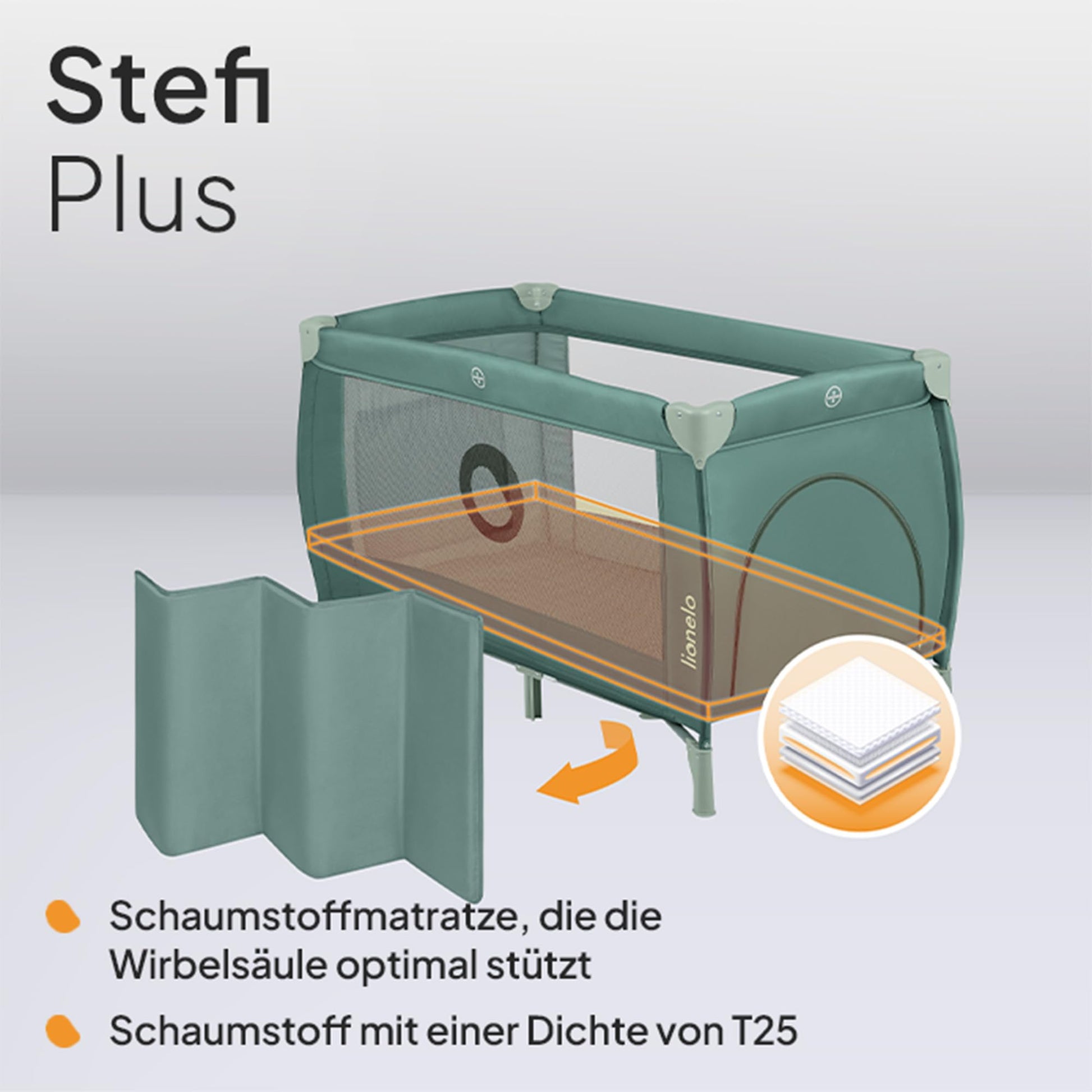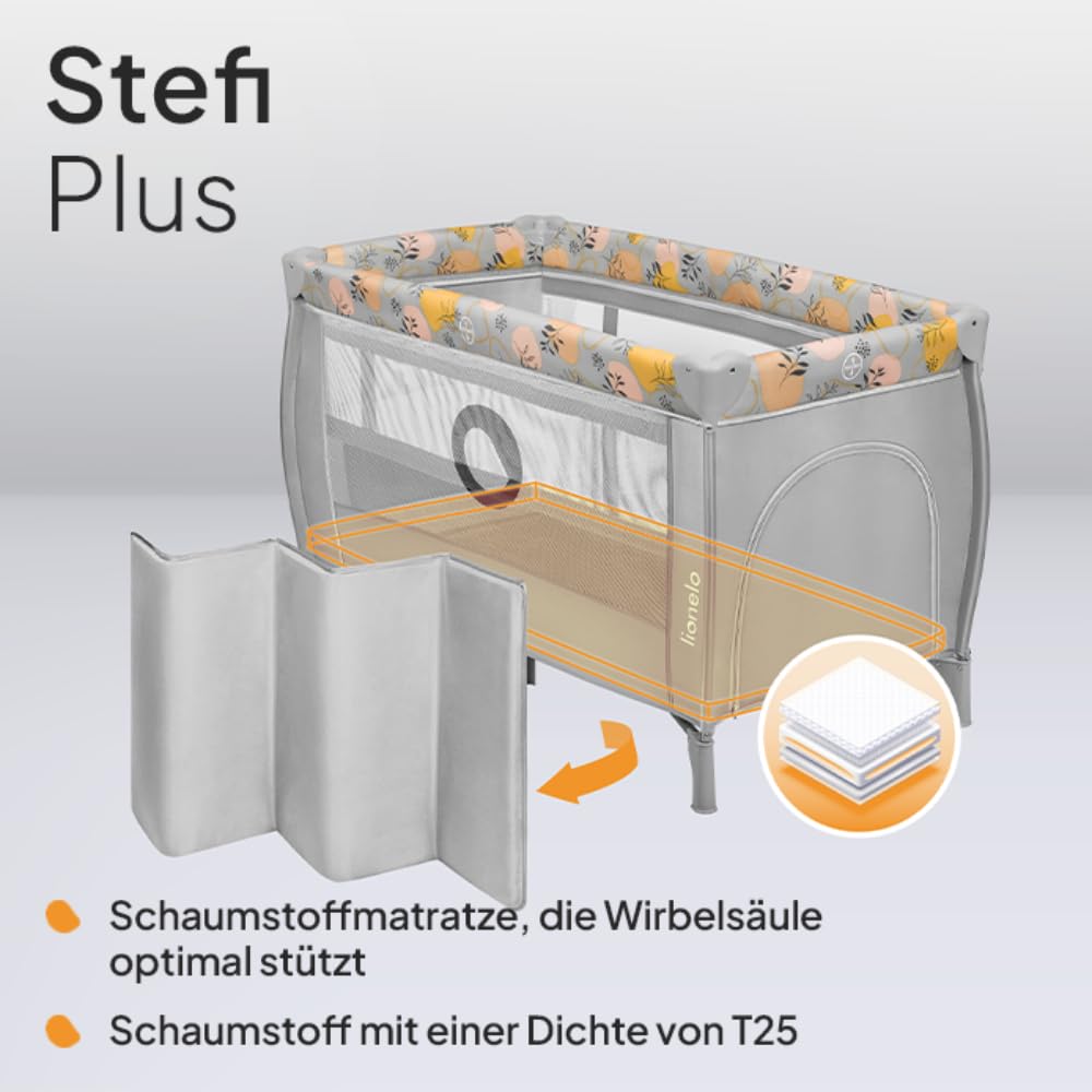 • INNOVATIVE MATRATZE: Im Reisegitterbett Stefi Plus wird eine neue Matratze aus 2 cm dickem T25-Polyurethanschaum verwendet, die die Wirbelsäule richtig richtet. Das Material ist verformungsbeständig und sorgt so für die richtige Unterstützung der Schlafposition des Kindes und für Wärmeisolierung. Die Matratze kann auf zwei Stufen eingestellt werden: niedrig und hoch