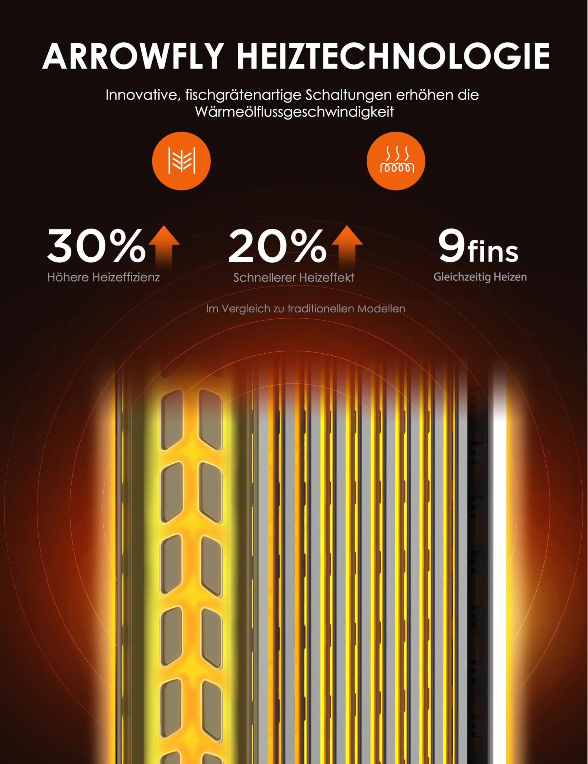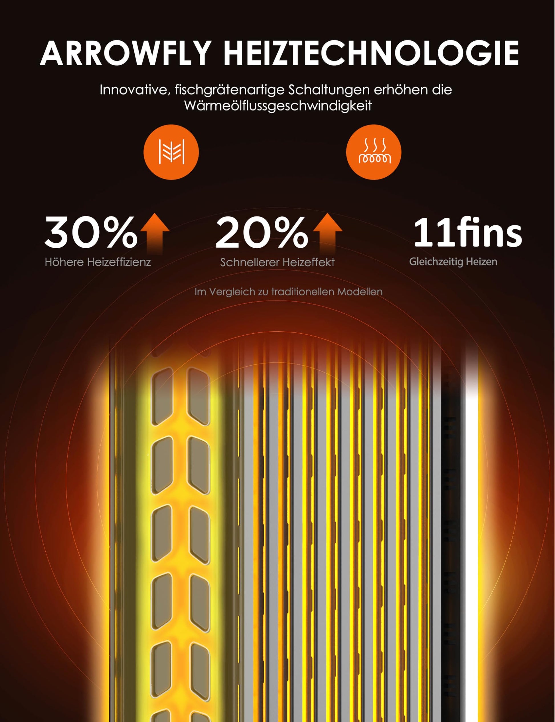 - Schnelle und effiziente Wärme: Dieser Heizkörper verfügt über innovative Arrowfly-Heiztechnologie mit ölgefüllten Fischgräten-Kreisläufen für hocheffizientes Heizen. Der 11-Rippen-Heizkörper erhöht schnell die Raumtemperatur und gewährleistet eine gleichmäßige Wärmeverteilung in großen Räumen – für zuverlässige und behagliche Wärme, wann immer Sie sie benötigen.