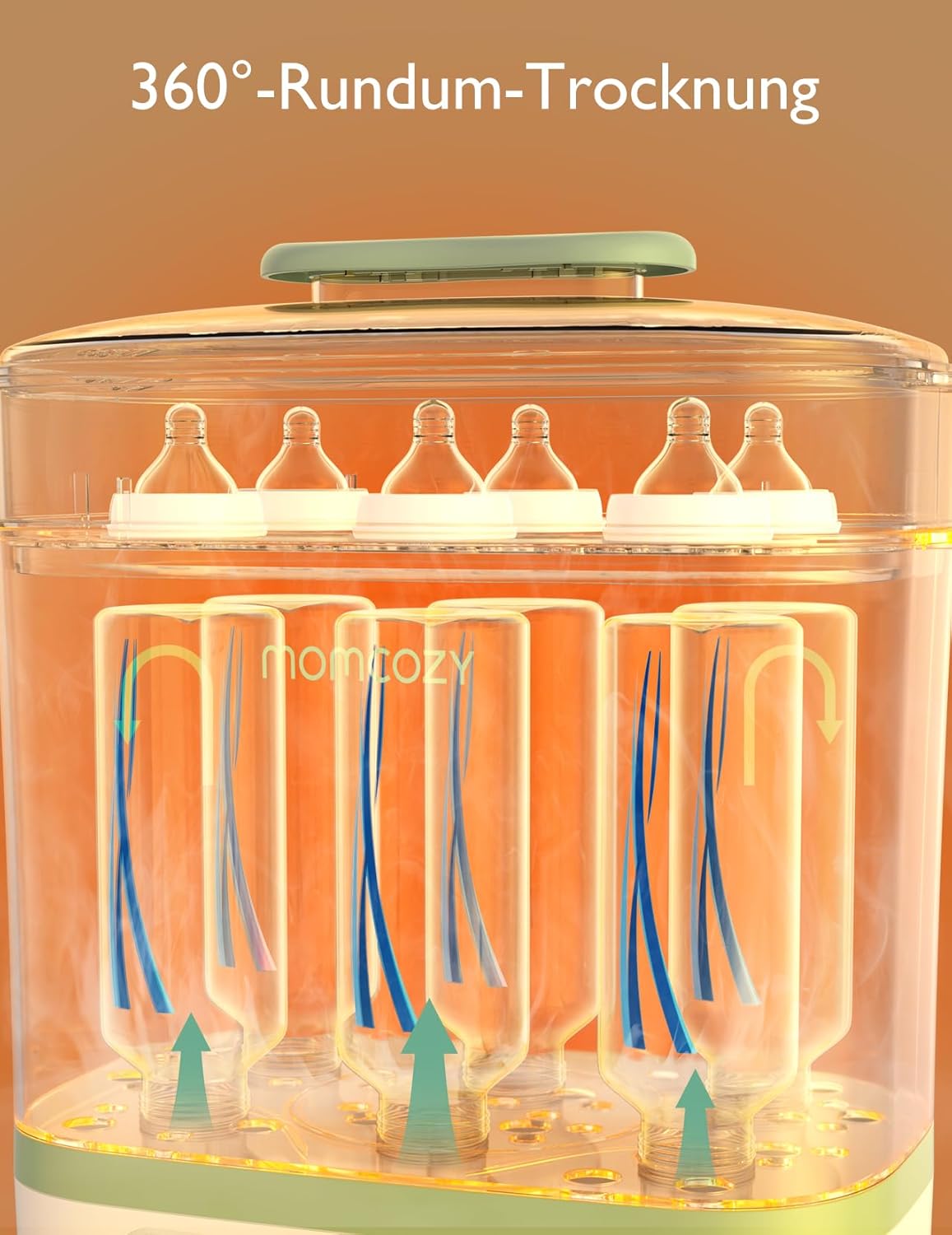 • Automatisches Trocknen und 24-Stunden-Keimschutz. Kein manuelles Umschalten – nach der Sterilisation startet der Trocknungsmodus automatisch. Dank des geschlossenen Systems des momcozy Babyflaschensterilisators bleibt der Inhalt bis zu 24 Stunden keimfrei – ideal für entspannte Elternabende.