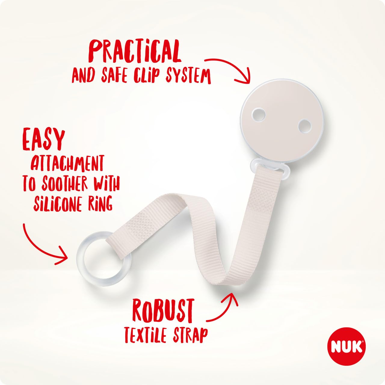 Sorgen Sie mit dem NUK Schnullerband dafür, dass der Lieblingsschnuller Ihres Schatzes jederzeit zur Hand ist. Dank Gedanken des praktischen Clips, der sich sicher an der Kleidung des Kindes befestigen lässt, müssen Sie sich nie wieder über verlorene Schnuller machen. Der flexible Silikonring lässt sich leicht an jeden Schnuller anbringen, der Clip ist aus robustem, bruchsicherem Tritan und PE und das Textilband aus strapazierfähigem Material. Erhältlich in einer Reihe von niedlichen und farbenfrohen Designs, die zur Persönlichkeit Ihres kleinen Lieblings passen.