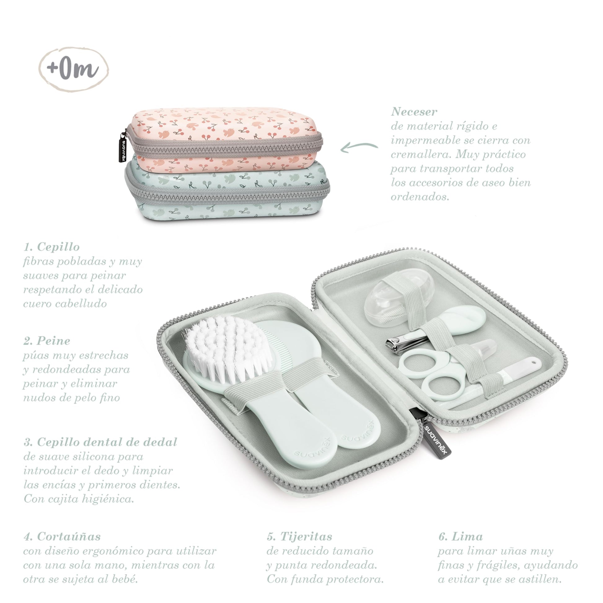 Kulturtaschenset für Babys mit 6 unentbehrlichen Produkten zur Erleichterung der täglichen und sanften Pflege, die das Baby vom ersten Tag anbraucht.