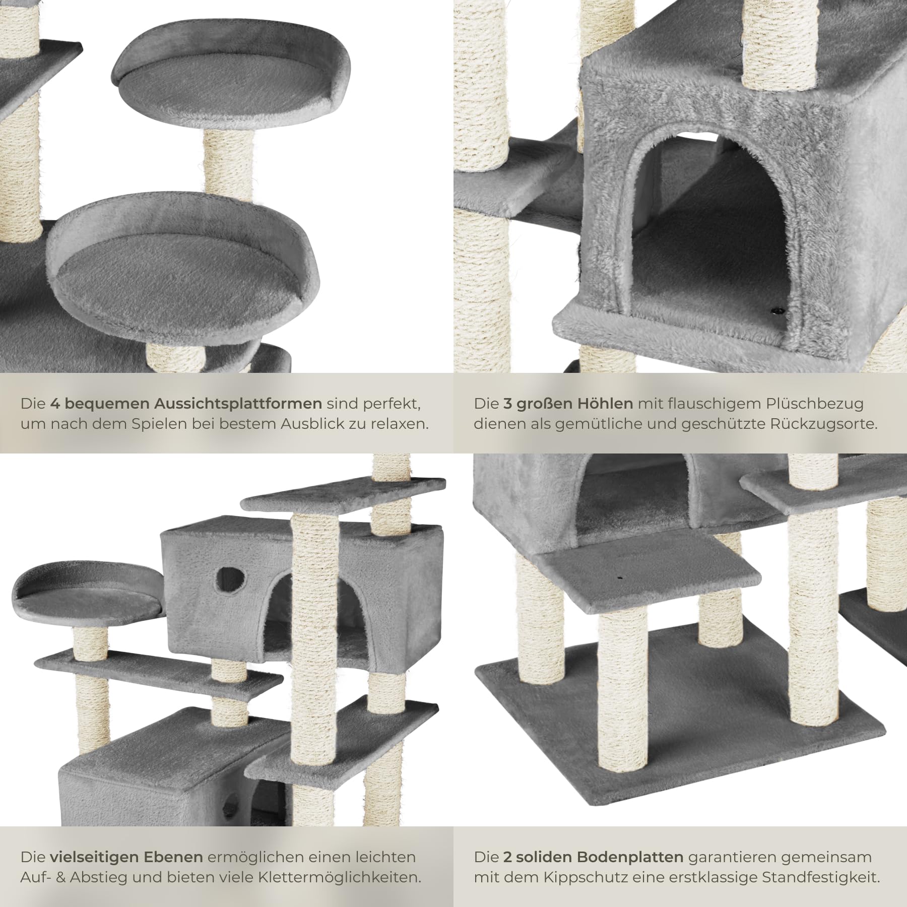 - KRATZBAUM GROß MIT KOMFORT UND KATZEN ZUBEHÖR: Neben Säulen als Kratzmöbel verfügt unser Kratzbaum XXL noch über verschiedene Aussichtsplattformen zum Ausruhen und Entdecken. Diese sind ideal, um die Neugier Deiner Katze zu wecken und sie zu beschäftigen, sind aber auch ein guter Ersatzschlafplatz, falls die Katzenhöhle gerade belegt ist. Diese Eigenschaften machen den Katzenbaum groß zu einem unverzichtbaren Katzenspielzeug.