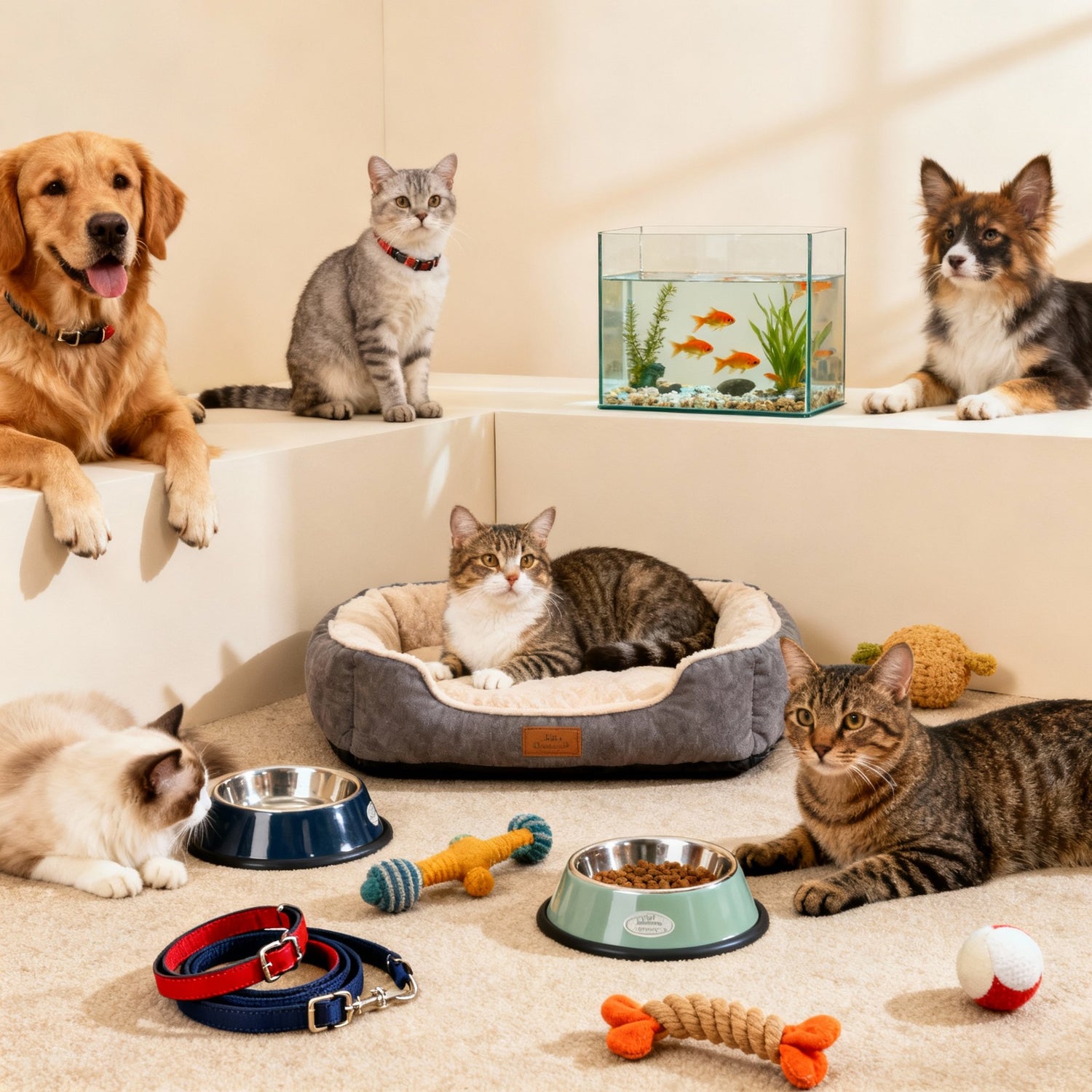 Bequeme Betten, lustiges Spielzeug und wichtige Pflegeprodukte für Hunde, Katzen und mehr.